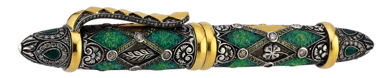 We adorned the pen's exquisite Silver barrel with luxurious 24K Gold plating, sparkling Diamonds, and mesmerizing Emeralds.